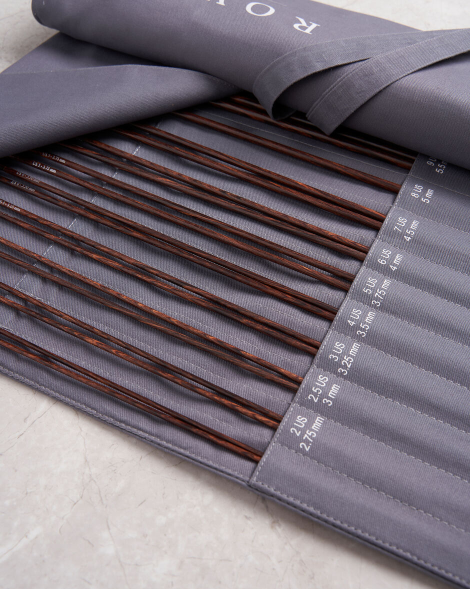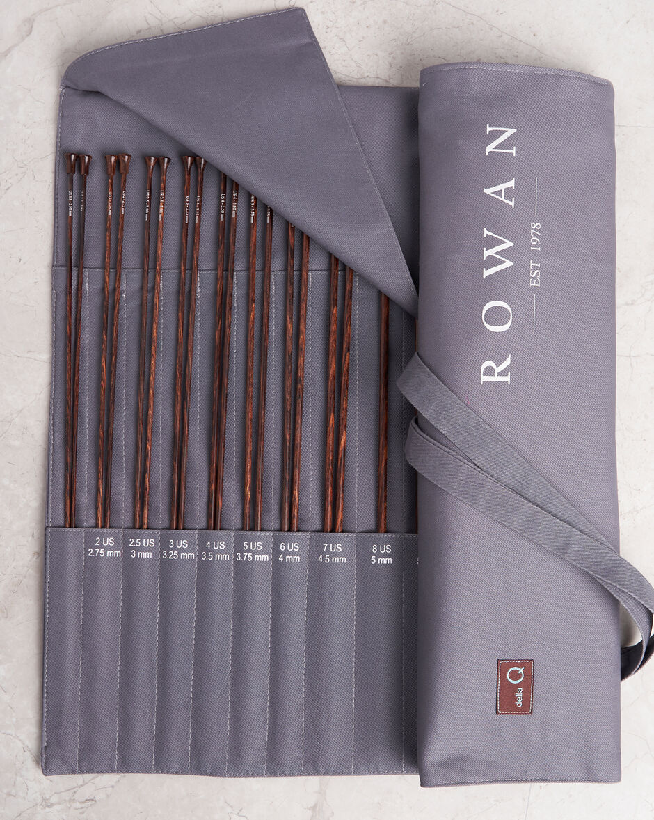 Our knitting needle roll will accommodate straight sets and contain all the pockets you could possibly need - and more! The individual pockets are labelled with mm/US needles sizes (with some extra blank pockets), so you can grab the right needle for your project at a glance. The roll is perfect to carry with you for travel, or just to have stashed in your knitting nook for organizational purposes. The needle roll measures W51cm x H39cm approximately and is co-branded with the della Q and Rowan logos.